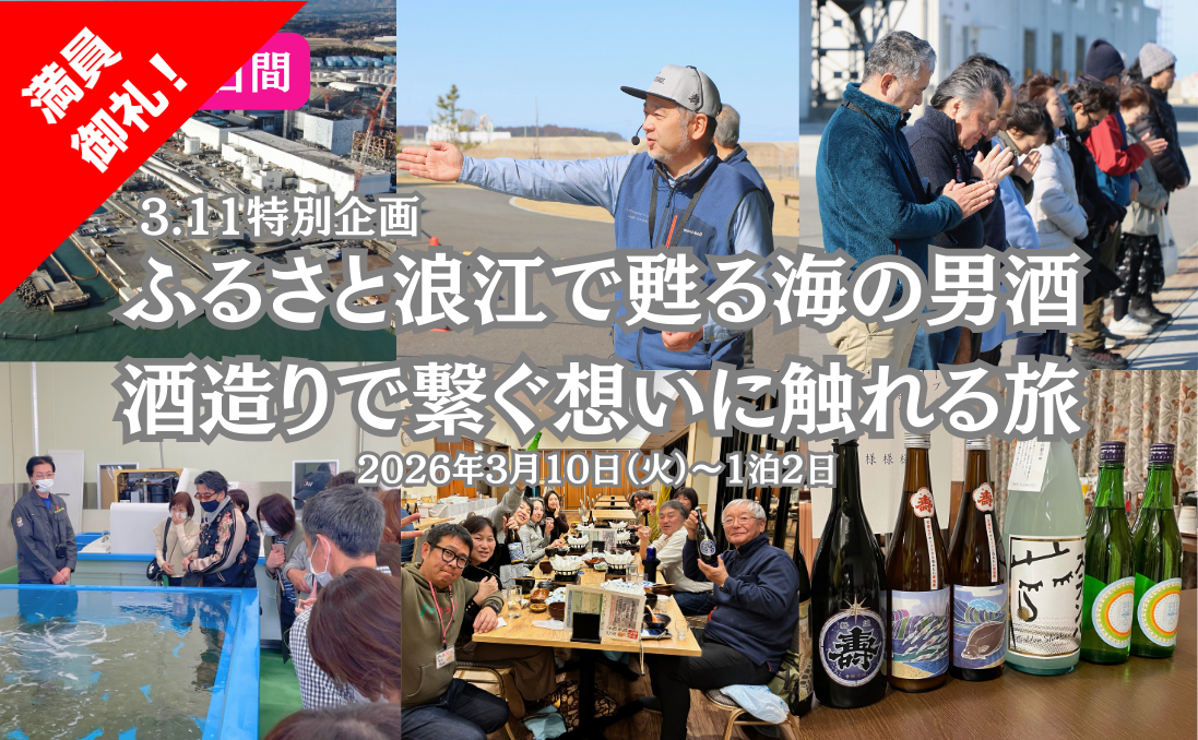 福島第一原子力発電所で、事故の経緯と廃炉の現状を視察。鈴木酒造店浪江蔵では、蔵元自らが語る「震災からの歩み」と「酒造りに込めた想い」に触れます。夜の懇親会では、特別な酒を酌み交わしながら、地元の方々や参加者同士で語り合い未来へ向けた乾杯。3.11当日の発災時刻14時46分には、請戸漁港で海に向かって黙祷。町の人々と同じ時間を共有する、心に深く残るひとときを迎えます。静かな感動と人とのつながりを感じられる特別な2日間です。