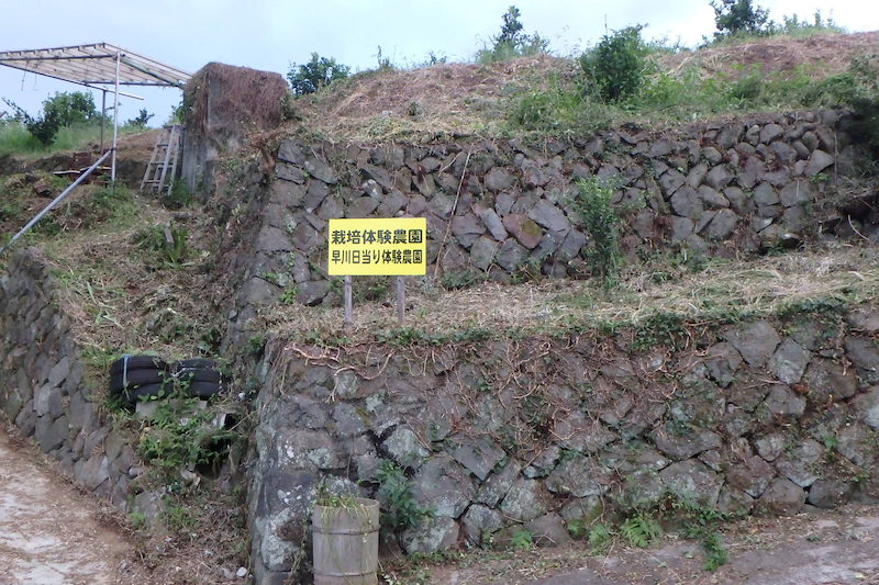 一般的に「みかん」といわれる温州みかんは、海沿いが栽培に適しています。小田原は温暖な気候と、富士山の火山灰による水はけのよい土壌、相模湾に面する地形に恵まれ、江戸時代に柑橘栽培が始まりました。石垣山の近くには、石垣で造成されたみかん畑があります。この石材も石垣山一夜城と同じ安山岩が使われています。