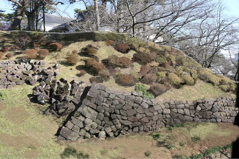 小田原城の本丸・二の丸周辺は、寛永9年(1632)の稲葉正勝の入封(にゅうほう)以後、大規模に改修され、主要な曲輪に石垣を積むなどして近世城郭への変貌を遂げました。明治3年(1870)に廃城となり天守や門や櫓が解体された後、大正12年(1923)の関東大震災で石垣も崩落しました。しかし、江戸時代に築造された石垣の構造のまま崩落したことから、往時の石垣の様子を想像することができます。
