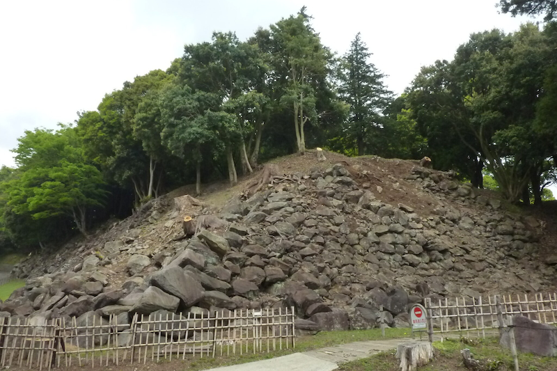 石垣山一夜城の野面積みの石垣は、安山岩やディサイトといわれる火山岩の一種が使用されています。小田原城の石垣と材質は似ていますが、築かれた時代が異なるため石垣の工法が異なっています。こちらも風雨や地震の影響などで崩れてしまっていますが、クレーン車やショベルカーなどの重機が存在しなかった時代に築かれた、巨大な土木構造物の当時の姿を想像することができます。